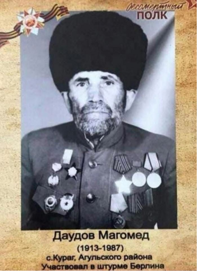Родился в 1913 году в селе Кураг Агульского района Дагестанской АССР. 15 января 1941 года был призван в армию Хивским РВК и ушел на войну. Участвовал в боях за взятие Кенигсберга и в штурме Берлина. За воинскую доблесть и отвагу красноармеец Магомед Даудов награжден двумя Орденами Славы, Орденом Красной Звезды, Орденом Отечественной войны II степени и многими другими наградами и медалями. Во время сражений был ранен и контужен. Домой вернулся в 1945 году. Дедушка заместителя Уполномоченного по правам ребенка в Республике Дагестан - Рустамовой Майрам Мирзаевны.