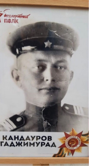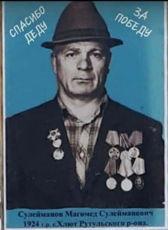 (1906-1974) В 1941 г. был признан на фронт. Он прошёл всю войну. Участвовал в битве под Сталинградом. Был ранен. Был награждён боевыми наградами: орденом Отечественной войны II степени и медалью «За отвагу». медалью «За боевые заслуги»; медалью «За победу над Германией» и другими. Участвовал в советско-японской войне. Вернулся домой осенью 1945 года. Дедушка заместителя начальника контрольно-аналитического отдела Контрольного управления Главы Республики Дагестан Абдурахмановой Наиды Камалудиновны