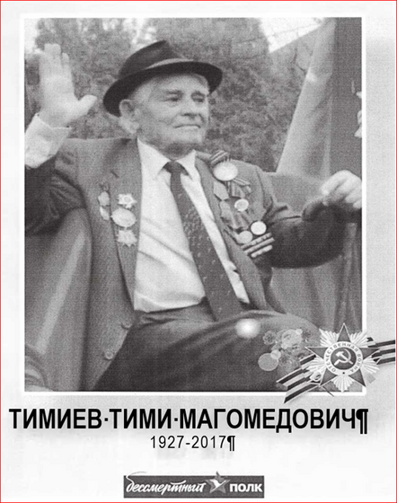 (1927-2017 г.)Тими Тимиев родился в 1927 году в селении Нижний ЧирюртКизилюртовского района Республики Дагестан. Детство его прошло втрудных довоенных условиях: еще ребенком ему пришлось испытать всетяготы и лишения того времени.Вместе с другими новобранцами из Дагестана он был зачислен в составБуйнакского запасного полка, где прошел курсы молодого бойца, поокончании которых стал ординарцем командира батальона.По распределению попал в военную школу № 49 для молодыхавиаспециалистов в городе Тбилиси (Грузия), где он обучился специальностимеханика для обслуживания боевых самолетов.После победного мая 1945-го батальон, в котором он проходил службу,перебросили на Дальний Восток. В составе военных самолетных экипажей егоподразделение было перебазировано несколько раз, с целью активныхбомбардировок военных сил вражеской Японии.Он принимал самое активное участие в общественной жизни городаКизилюрта и в военно-патриотическом воспитании подрастающего поколениягородского округа. Вел активную общественную деятельность, постоянновстречался с учащимися и молодежью.9 мая 2017 года вместе с кизилюртовцами он в последний раз участвовалв городском праздничном параде по случаю 72-ой годовщины ВеликойПобеды.Награжден орденом Великой Отечественной войны второй степени имногими другими юбилейными наградами, Почетными благодарностями и грамотами. После тяжелой продолжительной болезни на 90-ом году жизни, к сожалению, скончался».Дедушка консультанта Отдела здравоохранения ПравительстваРеспублики Дагестан Алиева Тамерлана Адамовича.