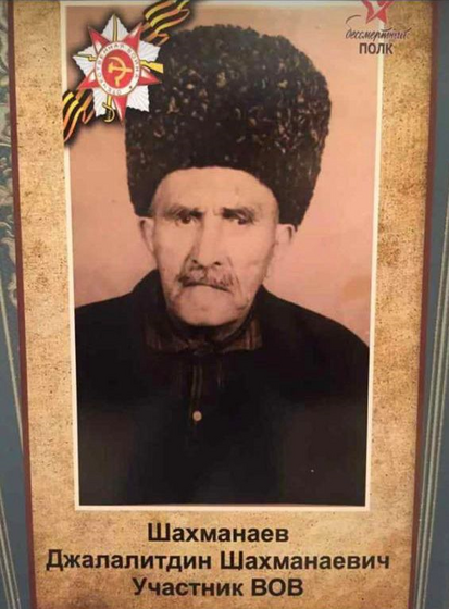Шахманаев Джалалитдин Шахманаевич родился в 1906 году в с. Карабудахкент Дагестанской АССР. Когда началась Великая Отечественная война, он в качестве бригадира колхоза был отправлен на оборонительные работы в Северный Дагестан. В марте 1942 года был призван Карабудахкентским РВК и ушел на фронт, воевал красноармейцем в составе 4 батальона 253 бригады. С боями дошёл до Северной Италии, дважды был ранен. После капитуляции фашистской Германии Джалалитдина Шахманаева командировали на Дальний Восток в составе дивизии, которая должна была участвовать в военных действиях СССР против Японии. Умер в 1989 году, в возрасте 82 лет. Награжден орденом Отечественной войны II степени, юбилейными медалями.Джалалитдин Шахманаевич, дедушка заместителя начальника Управления информационной политики и пресс-службы Главы РД Шахманаева Умар-Халипы Шахманаевича