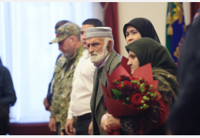 Глава региона вручил награду старшине Азамату Кадырову и старшему сержанту Тагиру Маликову. Ильмиямин Абдуллаев награжден посмертно. Его медаль Сергей Меликов передал вдове военнослужащего Альбине Арслангереевой.