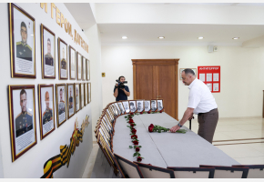 В начале мероприятия руководитель региона почтил память павших бойцов и возложил цветы к их портретам.