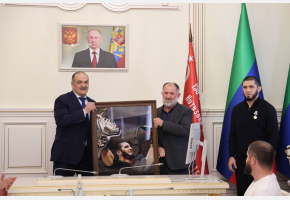 Сергей Меликов подарил спортсмену его портрет с фразой, которую Махачев произнёс на арене в Нью-Йорке после победного боя: «У нас самая сильная страна, самая сильная республика, самые лучшие бойцы».