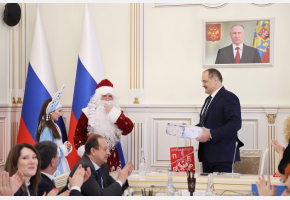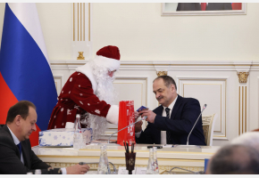После заседания особенные дети подарили Сергею Меликову новогодние подарки. Главные герои праздника — Дед Мороз и Снегурочка поздравили руководителя региона с наступающим праздником и передали коробку с открыткой, свечой и тарелкой, сделанными особенными детьми своими руками.