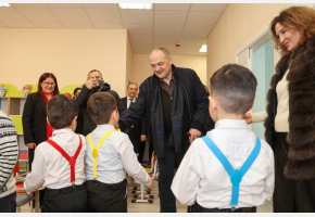 Трёхэтажное дошкольное учреждение рассчитано на 250 воспитанников – это 14 групп, в том числе две ясельные. Глава республики пообщался с сотрудниками и детьми, осмотрел пищеблок, игровые комнаты, актовый зал и другие помещения.