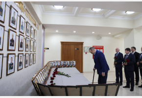 Глава региона возложил цветы к портретам павших бойцов и почтил их память минутой молчания.